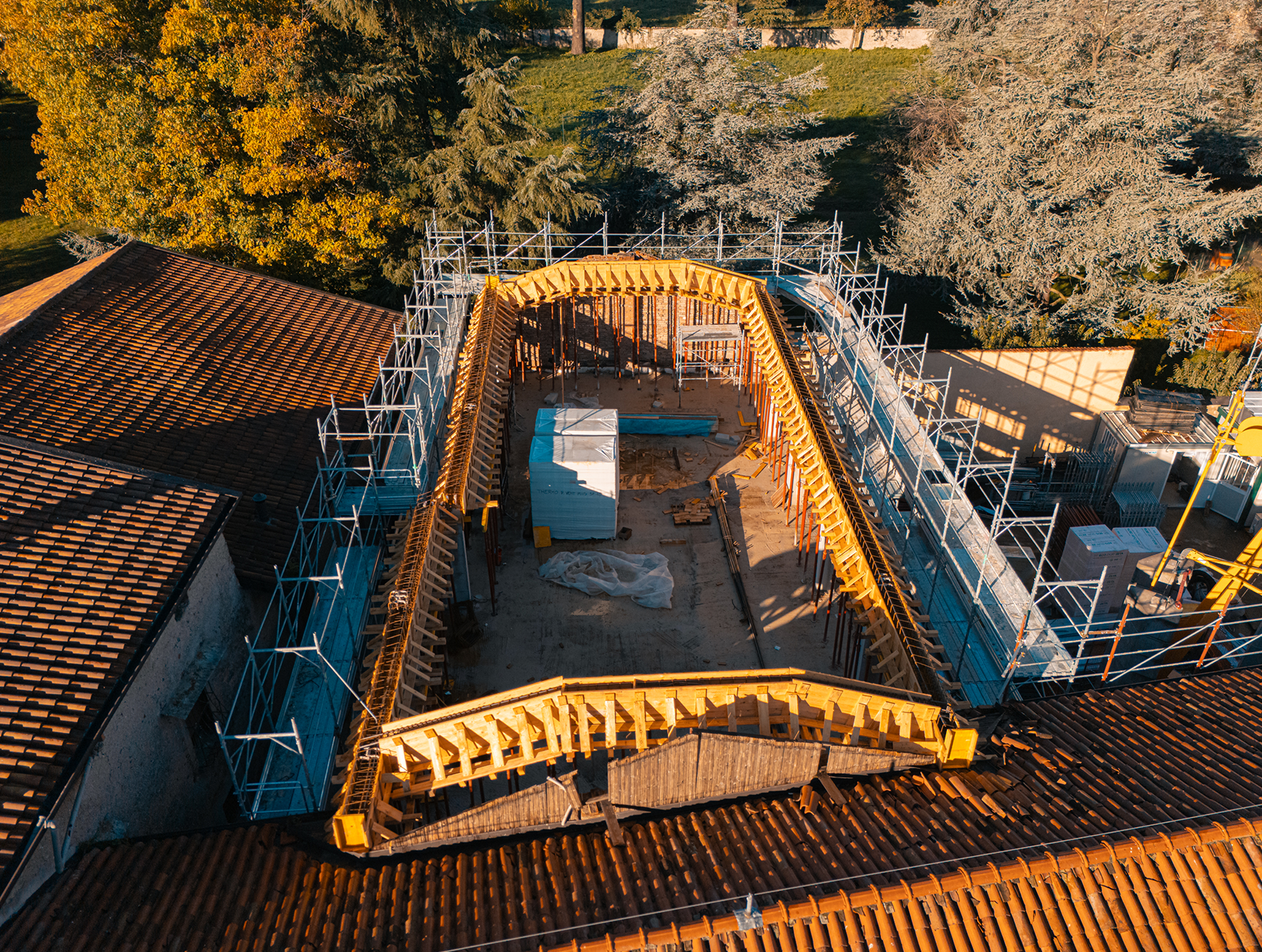 • Copertura: sostituzione di una porzione non conforme, rinforzo strutturale perimetrale in CLS e nuova copertura con struttura lignea lamellare.